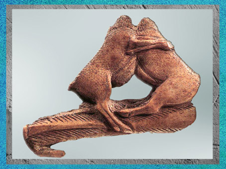 D’après des bouquetins affrontés, grottes de Lascaux, Dordogne, vers 18 000 avjc ; et deux cervidés enlacés, propulseur, grotte d’Enlene, Ariège, vers 18 000 -10 000 avjc ; France, magdalénien, paléolithique supérieur. (Marsailly/Blogostelle)