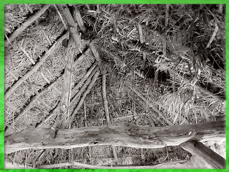 D’après une maquette, village néolithique, Yvelines, France ; une maison en torchis, bois et chaume et sa toiture, détail, Saint-Just, Bretagne, France ; néolithique. (Marsailly-Blogostelle)