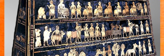 D’après des scènes de banquet, sceau de la reine Puabi, et Étendard d’Ur, mosaïque de coquille ; tombes royales d’Ur, 2600-2500 avjc, période des dynasties archaïques sumériennes, Ur, Irak actuel, Mésopotamie. (Marsailly/Blogostelle)