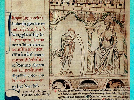D’après le druide Merlin, qui lit ses prédictions au roi Vortigern, manuscrit, British Library, art médiéval. (Marsailly/Blogostelle)