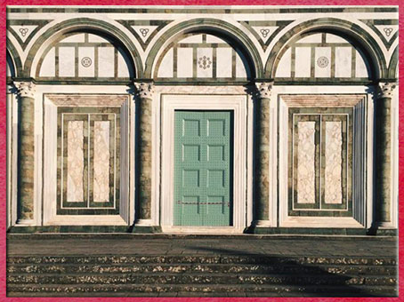 D’après l’église de de San Miniato, arcades en façade, XIe-XIIIe siècle, époque médiévale, Toscane ; et une étude de Filippo Brunelleschi, perspective du baptistère médiéval de Santa Maria del Fiore ; Florence, Renaissance italienne. (Marsailly/Blogostelle)
